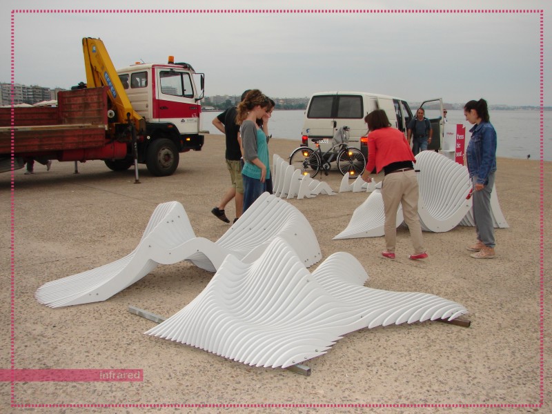 Infrared invites you at the installation thess bic seat?, part of the event "I Thessaloniki Allios" organized by Parallaxi, on Saturday 5th and Sunday 6th. The installation suggests a new way of seating at the Nea paralia of Thessaloniki, combined with a space for bicycle stands. The geometry of the constructed object consists of a sequence of gradually differentiating planes thus creating a fluid, complex form. The shape offers many possibilities of ways of seating as well as playing and climbing for the children.